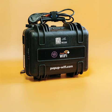 Punching far above its weight, the PopUp WiFi Lite is the go-to for trade show booths, site offices, Point Of Sale terminals, ticketing scanners, and guest WiFi. Note: not supported for live streaming. Bonding together any combination of the best-performing 2 x 4G and 1 x 5G bonded connection from Telstra, Optus and Vodafone, The Lite gives you go-anywhere connectivity with full live support 24/7. Supporting up to 50 simultaneous users with a coverage radius of 30 metres from the unit, all you need to do is plug, play and produce. Features WiFi and hardline connectivity with one ethernet port.